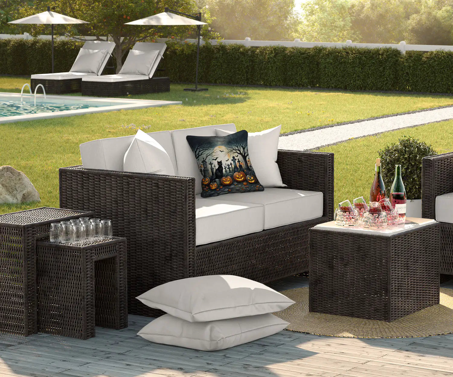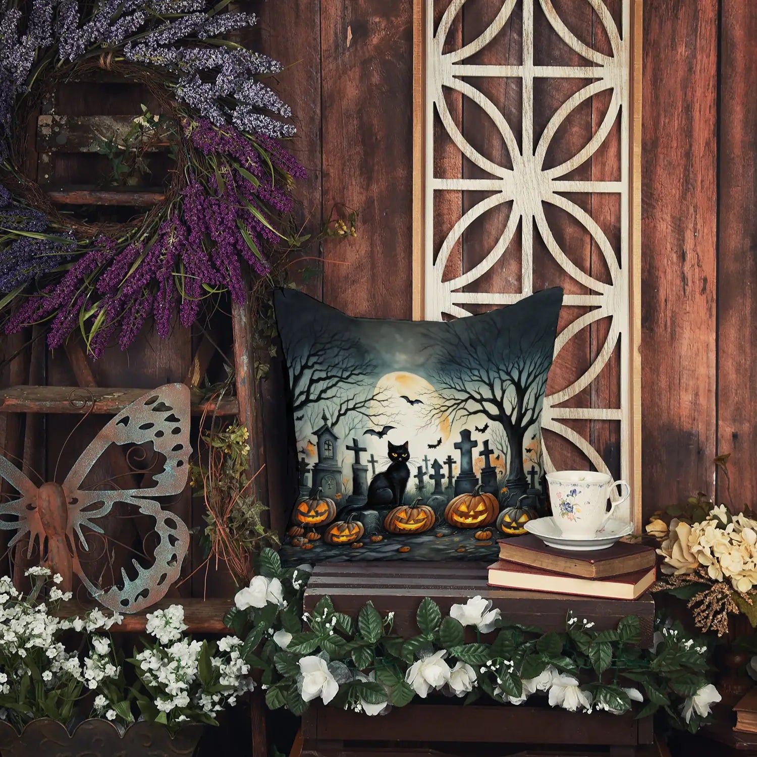 Celebrate Halloween with this Halloween Pillow. Revitalize your outdoor or indoor living space with Caroline's Treasures 18x18 Fabric Decorative Pillow. With a generously sized dimension of approximately 18 inches by 18 inches, this pillow makes a comfortable and aesthetic addition to any seating area. Made from a unique, water-resistant material developed by Caroline's Treasures, the pillow sham is 100% polyester fabric that's durable and ready to weather any condition. Its vibrant, full-color artwork will not fade over time as it is dyed with color-fast dyes. Whether you place it on your patio furniture, porch, veranda, or indoor couch, its soft canvas fabric ensures a cozy experience. The pillow is handcrafted in the United States, featuring a sham created from three pieces of fabric and a polyester insert for enduring shape and overstuffed comfort. Despite being robustly built to endure the outdoors, it is as soft and snug as your favorite indoor cushions. Please note, as all our pillows are handmade, sizes may vary slightly, adding to the charm of this unique decorative item.